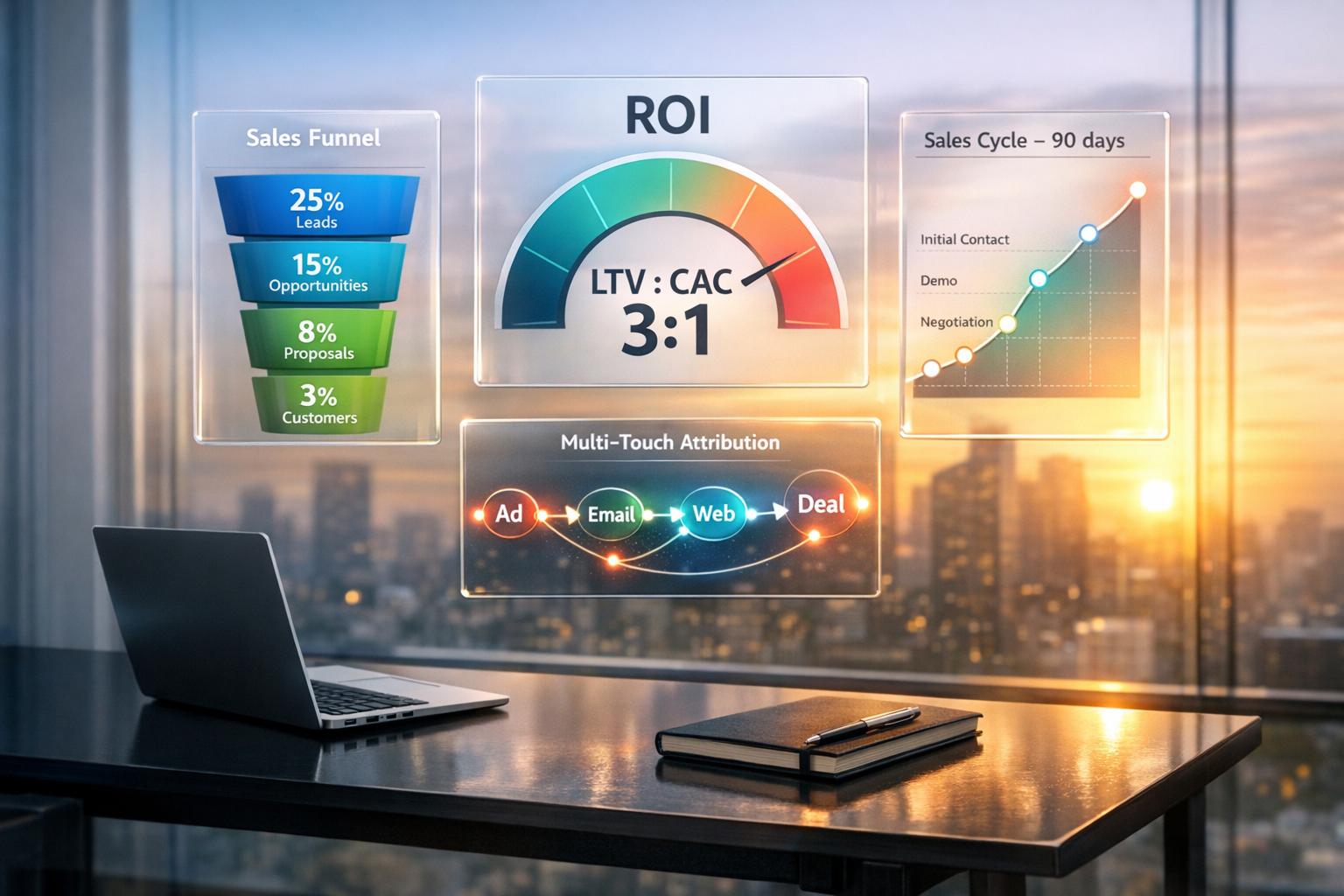 Practical guide to ROI in financial B2B: calculate CAC and CLV, set LTV:CAC targets, measure sales cycles and funnel conversion, and use multi-touch attribution.