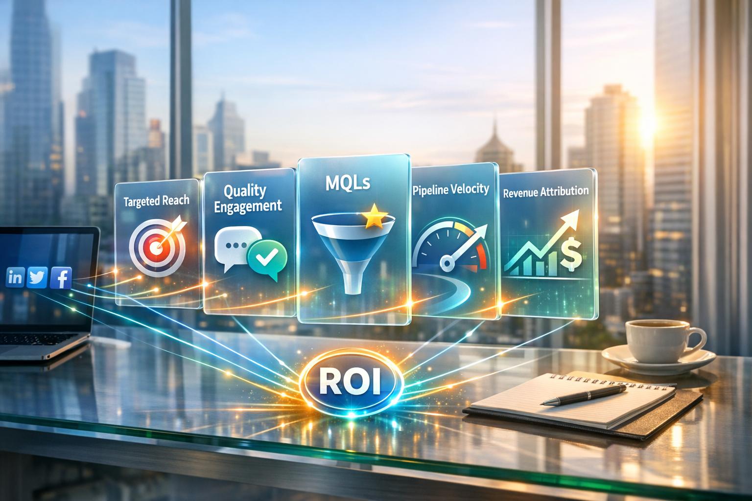 Use targeted reach, quality engagement, MQLs, pipeline velocity, and revenue attribution to prove social media ROI for financial B2B.